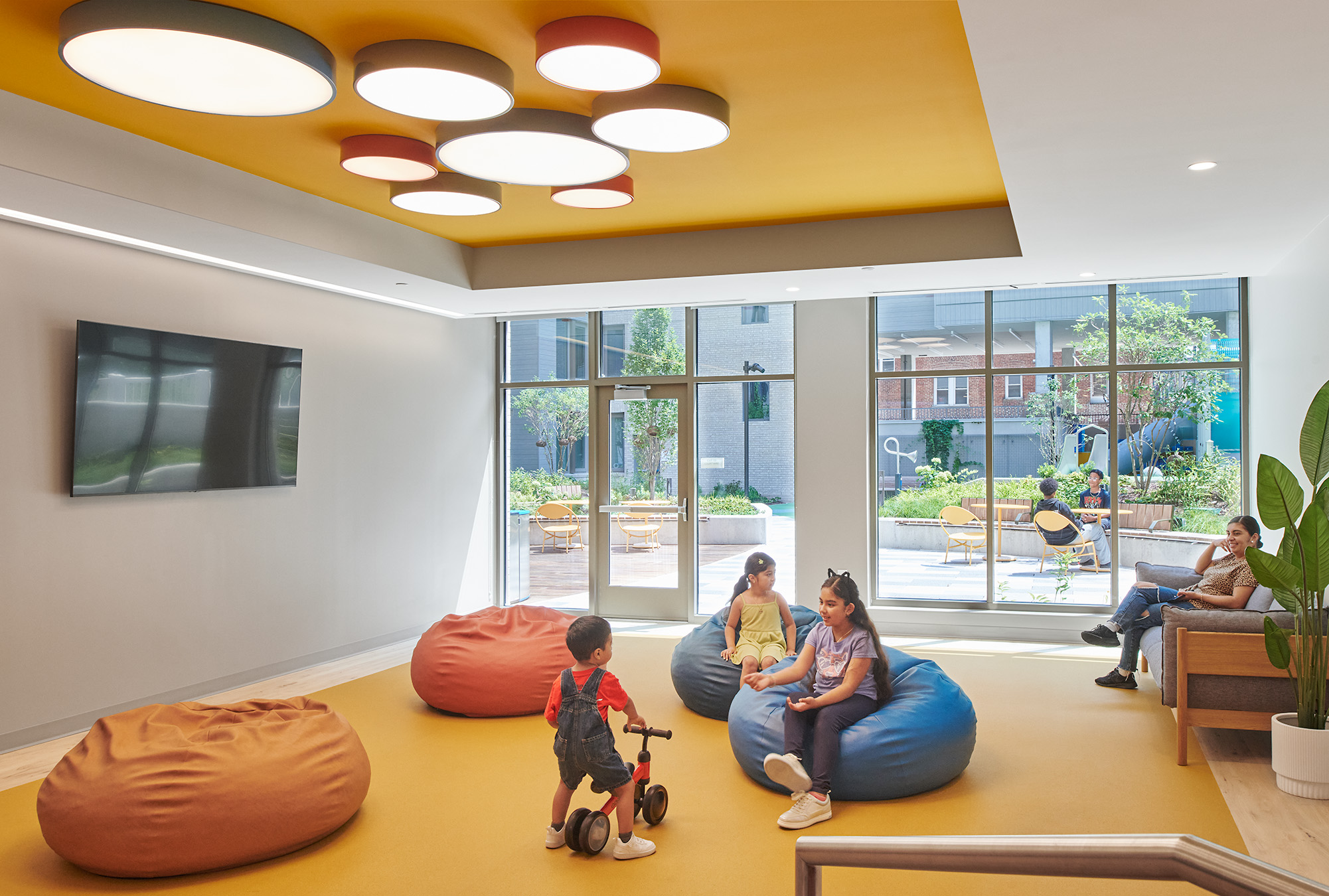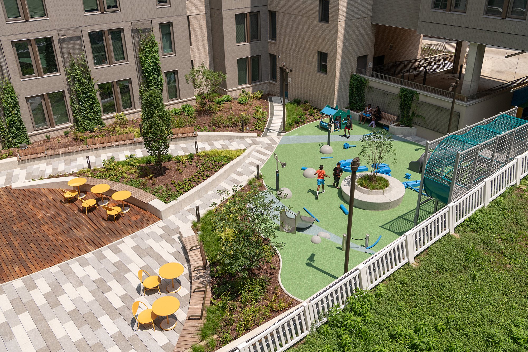 Financing for the $93.2 million development was arranged through an innovative mix of public and private resources, including $49.3 million in tax-exempt bonds issued by the DC Housing Finance Agency, a $16.9 million loan from the DC Department of Housing and Community Development’s Housing Production Trust Fund, and a $439,452 initial annual rental subsidy from the DC Housing Authority to support nine 3-bedroom units of Permanent Supportive Housing (PSH) dedicated for formerly homeless or at-risk families.